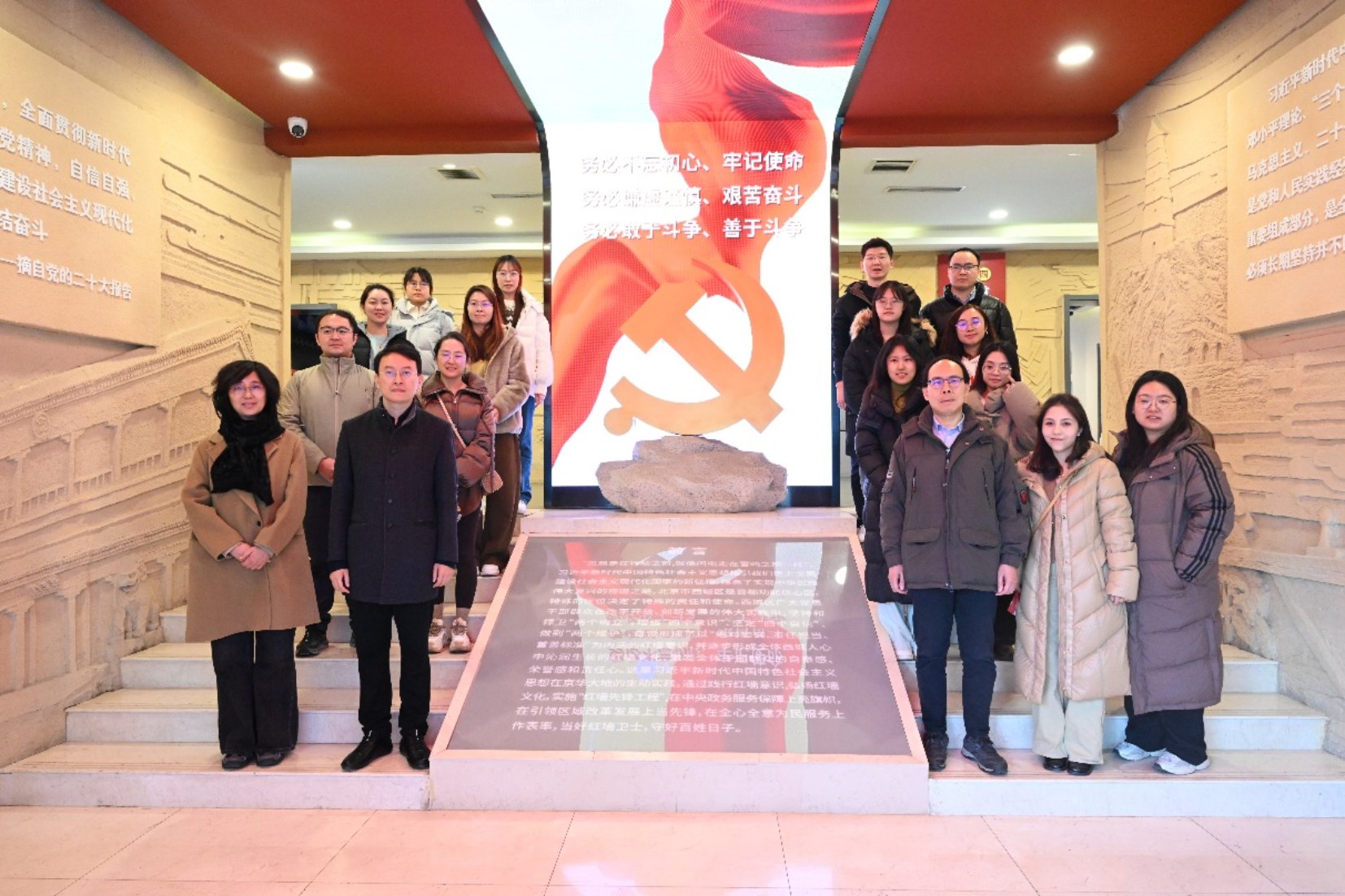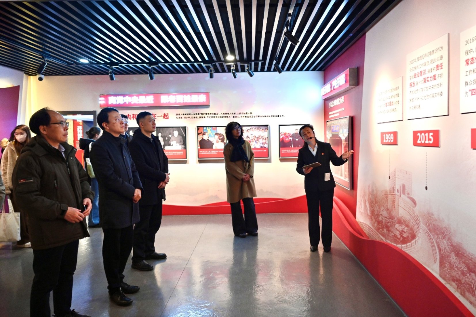 11月28日下午,调研团首先抵达西城区红墙意识教育基地,依次参观了“红墙在我心中”“绝对忠诚”“责任担当”“首善标准”“不忘初心 牢记使命”五个部分的展陈,系统了解“红墙意识”从起源、到纳入西城区工作指导思想乃至深化拓展的完整历程。通过西城区的“红墙先锋工程”,与12.9万名党员和“西城大妈”等群防群治力量共同筑牢基层治理防线的生动实践,调研团对政治引领在城市治理中发挥的根基作用有了更深刻的理解。